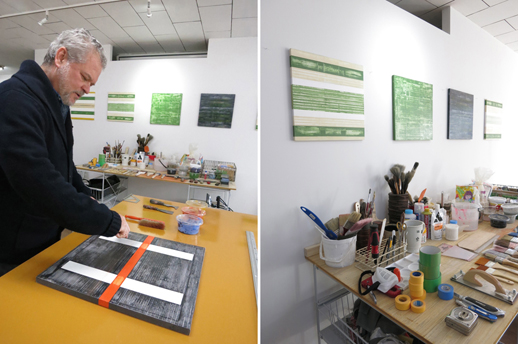 Gregさんの絵は、様々な物体や場所から得たインスピレーションを抽象的に表現したカラフルな作品です。私がアトリエにお伺いした時は東京の展覧会で見た「織部焼」に刺激を受けて制作しているという作品が掛けてあり、白い壁によく映えていました。