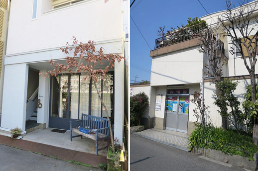写真左は明浄高校前のカフェ「ミスエヴァンス」。