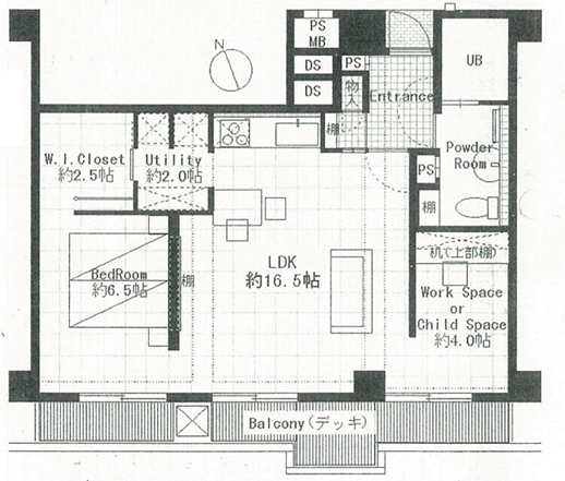 キッチン横にユーティリティ、ベッドルーム奥にはW.I.Cを設けています。