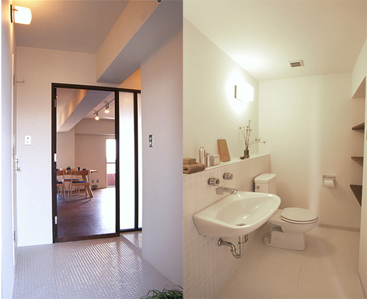 玄関を開けるとバルコニーからの風がスーッと抜けます/パウダールームは白で統一 ※いずれも竣工時の写真