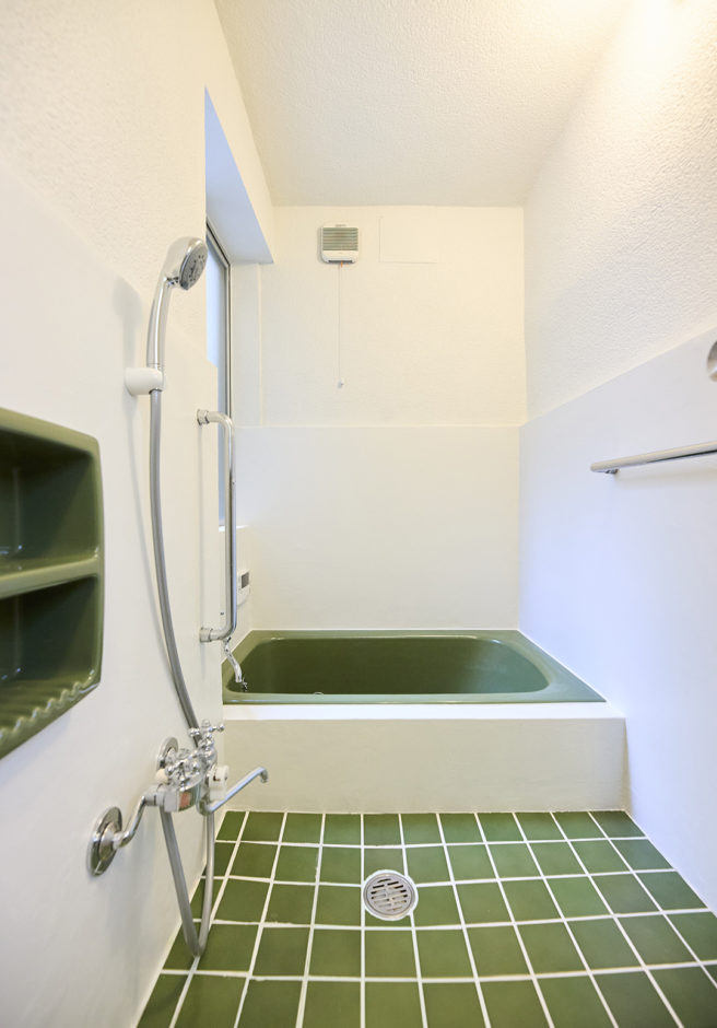 浴室は既存を利用し、特殊な塗料で塗装した。既存の浴槽、床タイル、ニッチ収納の緑色がアクセントに。