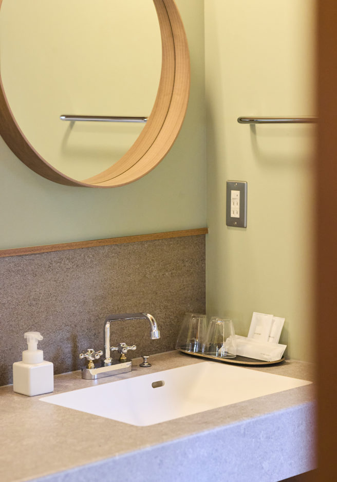住むには少々古臭いイメージを持たれ、あまり魅力的に思われない築年不詳の木造長屋住宅ですが、それぞれ個性や特徴を持っています。今回は宿泊施設ということで、この建物の個性や特徴をどこか懐かしいけどホテルのような非日常感を併せ持った魅力に変換させるような設計を目指しました。広い縁側をセカンドリビングのような洗面空間に、玄関すぐの応接室空間をエントランスロビーに、新旧が混じり合う空間である中で古いものも残して新しいものと馴染ませたり対比させることで古い装飾や設備などがレトロな魅力的に見えるように、和の要素も無理に消さずに逆に強調させることで、インバウンド旅行客はもちろん日本人旅行者にも新鮮に感じてもらえるような工夫を随所に施しています。(塩谷)