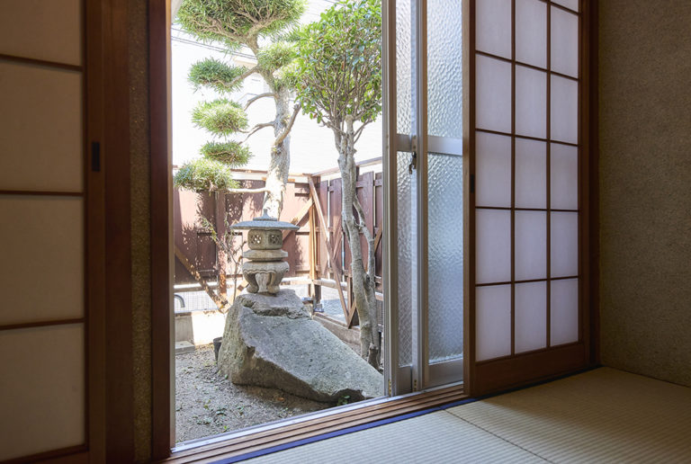 Kさんの希望で木々や石灯籠をそのまま残した坪庭。四季の移ろいを感じられる。