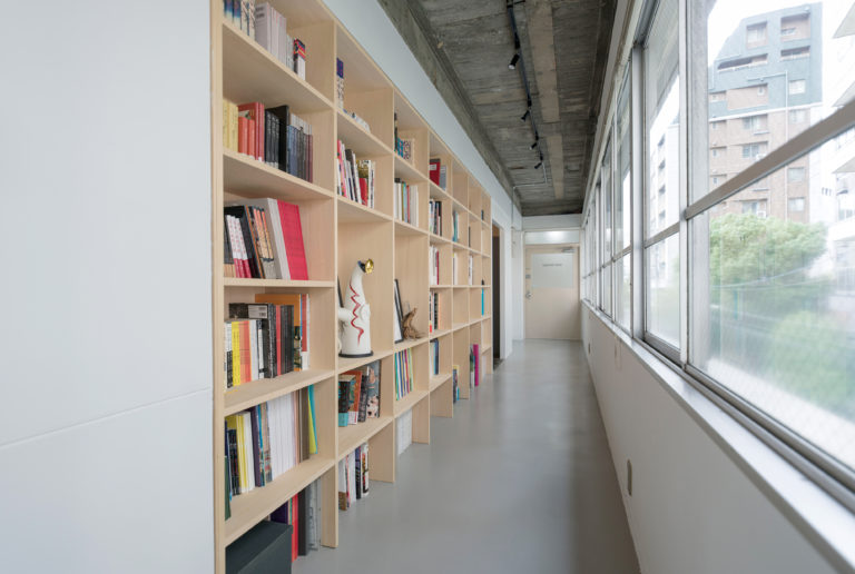 新区画につながる通路部分。セットバックしたスペースを利用して大量の資料を収納できる本棚を造作。資料もきれいに整理できて、効率がよくなったそう。