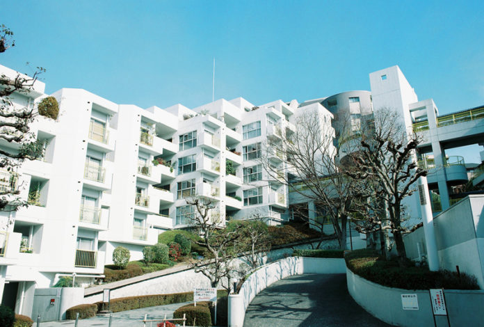 白く雁行した建物が立ち並び、ビビッドな黄色い手すりがついたかまぼこ状の空中廊下が部屋同士をつなぐ特徴的な外観。建築家遠藤剛生氏が設計した数多くの共同住宅の中でも代表的なマンションで、広場があったり、小さなプールがあったり、小さな街のようで敷地内を歩くだけでもワクワクします。