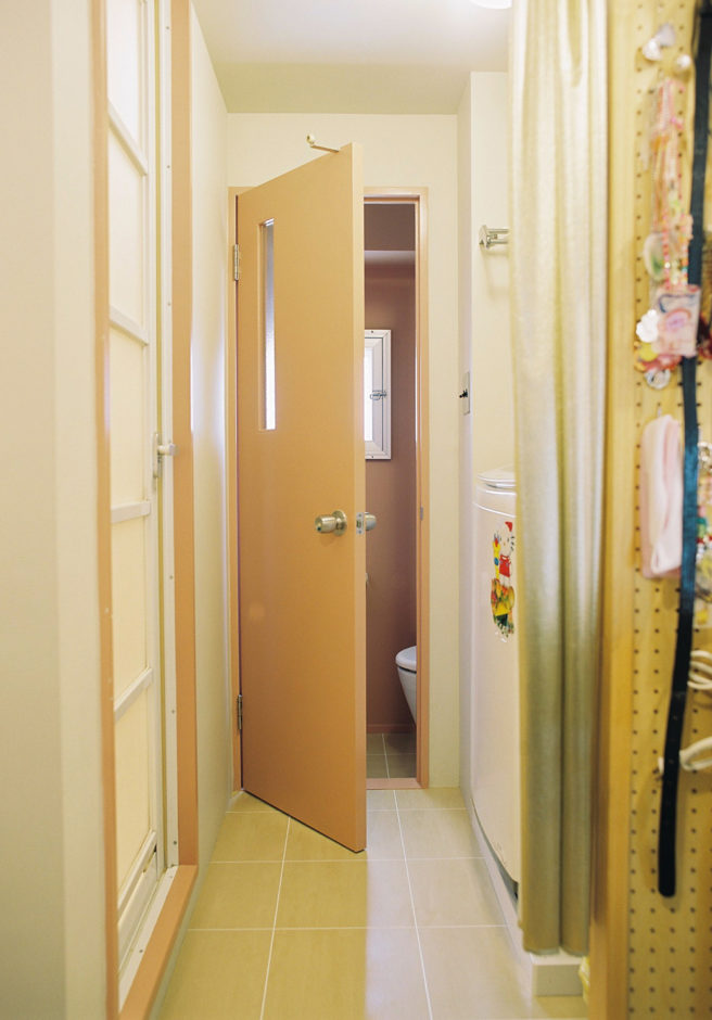 脱衣室~トイレのポイントカラーはローズピンク。トイレのクロスに合わせてドア・枠を調色塗装。