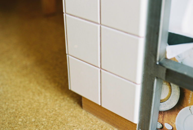 タイルの足元は木巾木が少し奥に入り込んだようなデザインに。コルクタイルは、床は以前雑誌で見かけていいなと思っていたもの。途中色々悩んだが、最終的には原点回帰で採用が決定。