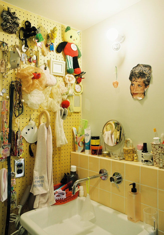 タイルは淡いオレンジに、目地はビスケットカラー。有孔ボードは実用とアートワークに大活躍!