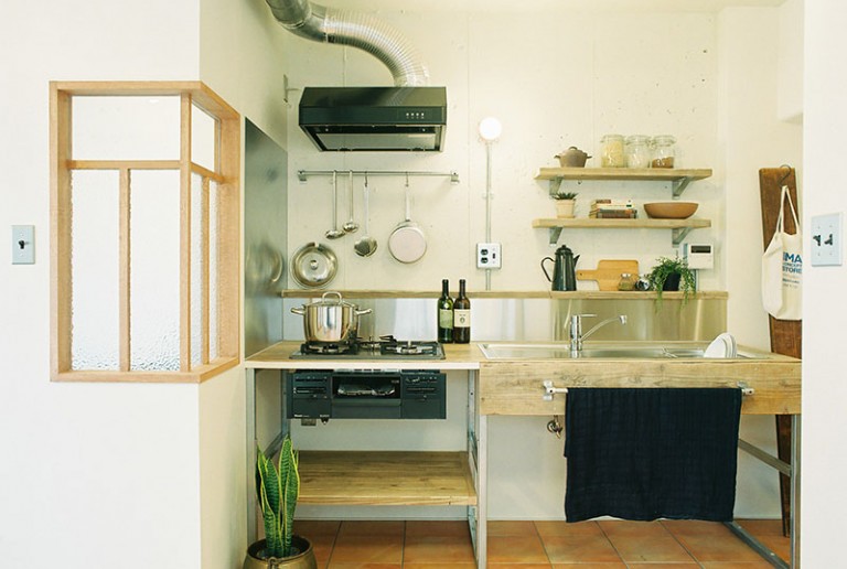 足場板の天板とステンレスの流し台を組み合わせラフな印象の仕上がりに。