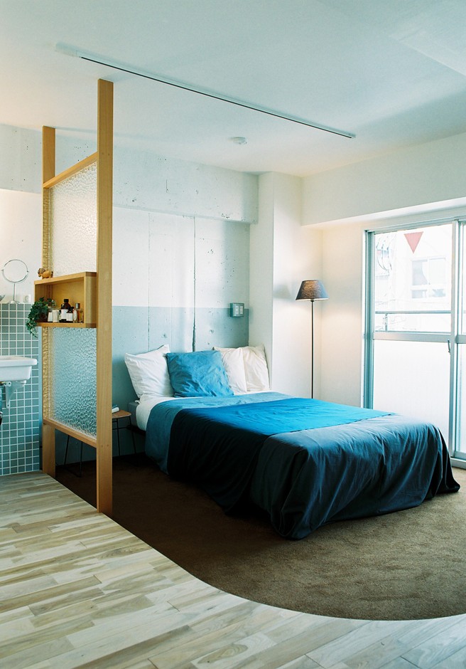ワンルーム。リビングとダイニングを兼ねたソファ使いが部屋を広く見せる。