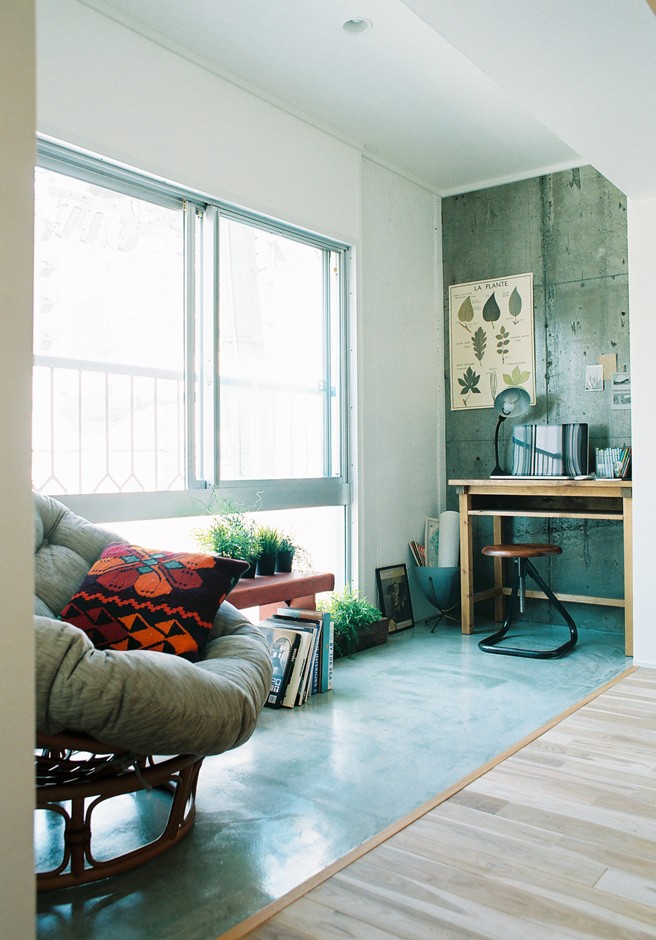 窓際に設けたモルタル仕上げの約3畳の空間〈Den〉