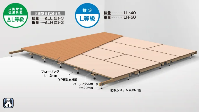 L値は日本工業規格(JIS)に基づいて実験室で測定したデータです。現場の状況によって音の伝わり方は様々なので、遮音性能を保証するものではありません。また、スラブ厚は150mmのコンクリートでの実験をしているので、古いマンションなどでスラブ厚が薄い場合、もしくは不明の場合は基準を満たすことができない場合もあります。